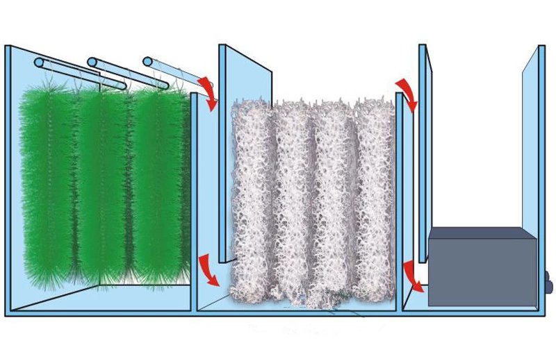 一、FOK式:它的特点是滤材毛刷或生化毡或者其他有效的生化材料整齐排列在槽中,鱼池与过滤槽并排同一水平面,过滤泵在尾端抽水,水自然过滤。此方法在广泛应用于小渔民观赏鱼池设计与建设公司的工程上。也是台湾日本目前流行型式。
