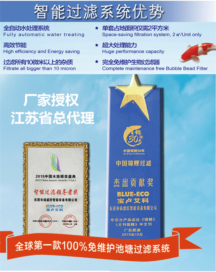 开创锦鲤鱼池智能过滤3.0时代,中欧合作产品,全自动控制,占地面积小,自动反冲洗、无冲洗死角,培养水中亚硝酸菌在滤珠上生长,可自动分解水中的氨。苏州祥和精创净化工程有限公司特约江苏省经销商,能保证提供优质售后服务,请各位亲们放心购买!!咨询电话:15190086818